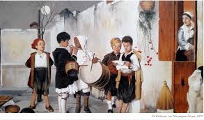 Χριστουγεννα, πρωτουγεννα, πρώτη γιορτή του χρόνου, Για εβγάτε, διέτε, μάθετε που ο Χριστός γεννάται Γεννιέται κι ανασταίνεται στο μέλι και στο γάλα, Τα μέλι τρων οι άρχοντες, το γάλα οι αφεντάδες Και το μελισσοβότανο το λουζοντ’ οι κυράδες. Κυρά ψηλή, κυρά λιγνή, κυρά καμαροφρύδα.