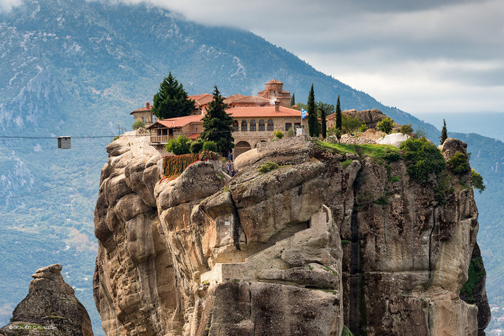 Τα μοναστήρια των Μετεώρων υψώνονται στο κέντρο της Ελλάδας, όπου ο Πηνειός ποταμός αναβλύζει από τα βαθιά φαράγγια της Πίνδου και χύνεται στην θεσσαλική πεδιάδα. Πρόκειται για γιγάντιους βράχους που έχουν χαραχθεί από τον χρόνο σε μια ποικιλία σχημάτων. Γκρίζοι σταλαγμίτες που υψώνονται προς τον ουρανό, εμφανίζονται ως δώρο της φύσης στους ευσεβείς που, παρακινημένοι από την πίστη, έχουν επιλέξει τη μοναξιά και μια ζωή λατρείας. Τα Μοναστήρια, με τις ξύλινες στοές και τις στέγες με κορνίζες, στεφανώνουν τις κορυφές αυτών των τρομερών κορυφών. Κρεμασμένα επισφαλώς πάνω από τις σκοτεινές αβύσσους, με την οροσειρά της Πίνδου στο πίσω μέρος τους και την απέραντη πεδιάδα, τα δάση, τα φαράγγια και τα γραφικά χωριά από κάτω, αυτά τα απόκοσμα ερημητήρια συνθέτουν έναν από τους πιο μαγευτικούς τόπους στη γη. Στην ύστερη βυζαντινή περίοδο και κατά την οθωμανική κυριαρχία, αυτή η μοναστική κοινότητα έγινε ιερό των διωκόμενων.
